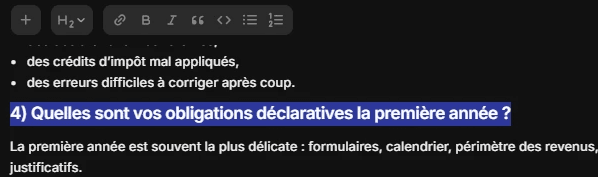 Le titre de votre article correspond au H1. C'est le champ "Titre" que vous avez renseigné à l'étape précédente. Vous n'avez pas à le recréer dans le corps de l'article, il est intégré automatiquement.